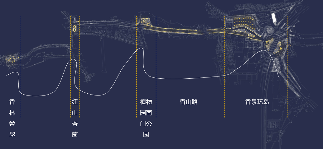 規(guī)劃設(shè)計中,信達(dá)設(shè)計師以香山環(huán)島、植物園南門入口公園、紅山香茵、香林疊翠為主要節(jié)點,并與行道樹形成明暗相間、峰谷韻生的亮度節(jié)奏,呼應(yīng)香山山水環(huán)繞的自然格局。
