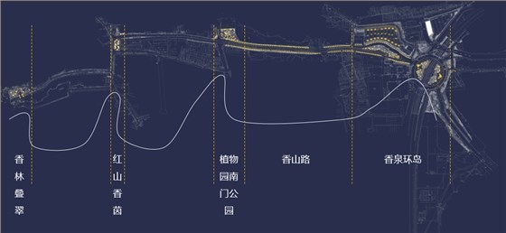 規(guī)劃設(shè)計(jì)中,信達(dá)設(shè)計(jì)師以香山環(huán)島、植物園南門(mén)入口公園、紅山香茵、香林疊翠為主要節(jié)點(diǎn),并與行道樹(shù)形成明暗相間、峰谷韻生的亮度節(jié)奏,呼應(yīng)香山山水環(huán)繞的自然格局。