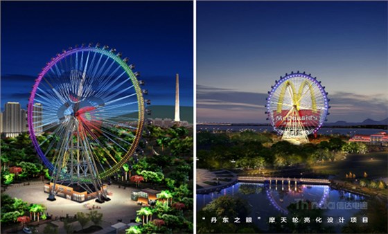 “丹東之眼”是中朝邊境一道亮麗的風(fēng)景線,信達(dá)電通在設(shè)計(jì)中采用絢麗的燈光和濃重的色彩。設(shè)計(jì)師通過(guò)燈光的動(dòng)態(tài)變化、光色的轉(zhuǎn)換,創(chuàng)造出一個(gè)歡樂(lè)、覽勝的燈光樂(lè)園。當(dāng)夜晚降臨,彩燈閃爍,摩天輪一圈圈地劃過(guò)點(diǎn)亮丹東最美天際線,顯現(xiàn)出其非凡的魅力!