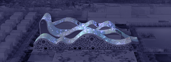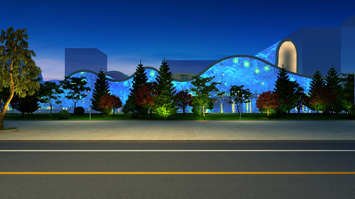 美術(shù)館建筑整體是曲線勾勒頂部與圓形創(chuàng)意形態(tài)展現(xiàn)立面結(jié)構(gòu)相結(jié)合。照明手法是將建筑在白天的曲線美,通過燈光向夜晚延伸。