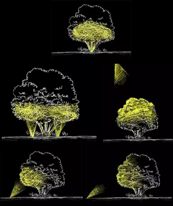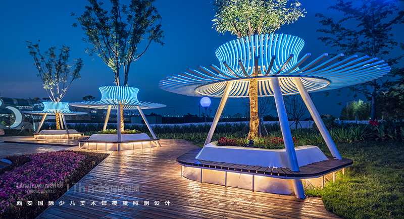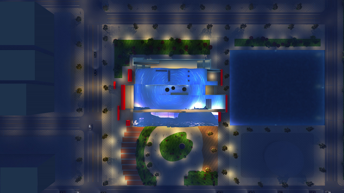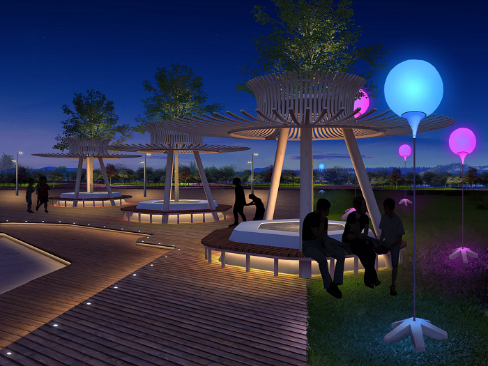 廣場燈光從色彩上尋求變化,增加燈光與人的完美互動。區(qū)域以高亮度照明呈現(xiàn),節(jié)假日以彩光呈現(xiàn),突出入口標識性設(shè)計。廣場綠植依據(jù)植物的大小形態(tài)進行燈光設(shè)計,燈具隱藏,綠色生態(tài),營造舒適的夜間光環(huán)境。