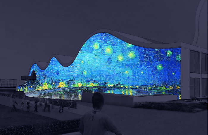 梵高的《星空》在建筑西立面的整體幕墻進行投影,充滿了運動和變化,從視覺上為每個少兒的心靈描繪出藝術(shù)的圣殿。