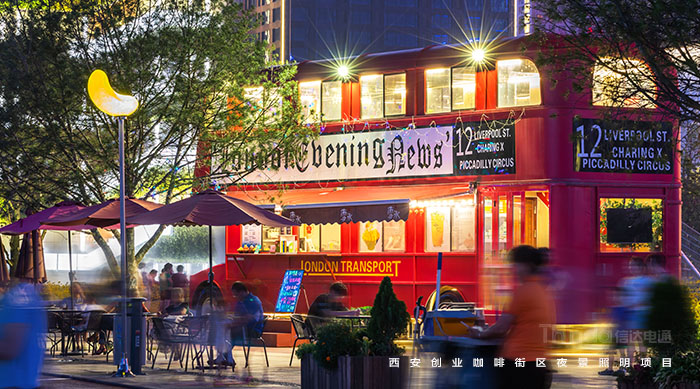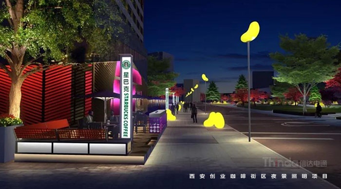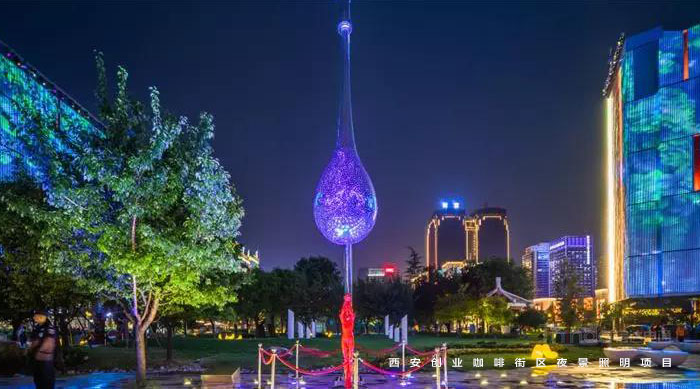 信達(dá)電通在2017年完成了眾多大型城市亮化項(xiàng)目,其中濃墨重彩的一筆當(dāng)屬西安創(chuàng)業(yè)咖啡街區(qū)的亮化。