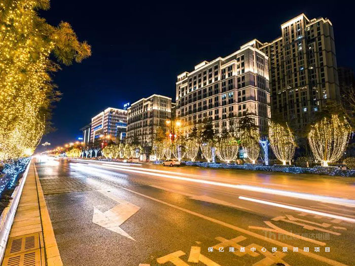 玻璃幕墻與石材相結合的立面材質營造了保億隆基的高端商務氛圍,此次夜景亮化設計工程也是以營造商務氛圍為著力點,對保億隆基中心和風景御園等周圍建筑樓體進行統一亮度規劃。樓體頂部采用一級照明,營造天際線的效果。樓體四周采用內透光和局部照明手法,突出保億隆基的建筑外形和結構特色。路邊樹木采用三級照明,點綴照明效果,與周圍的夜景氛圍相協調。在信達電通的全過程服務下,保億隆基中心形成了具有層次韻律的夜間形態,加之得天獨厚的地理優勢,成為經開商務核心區的新標桿。